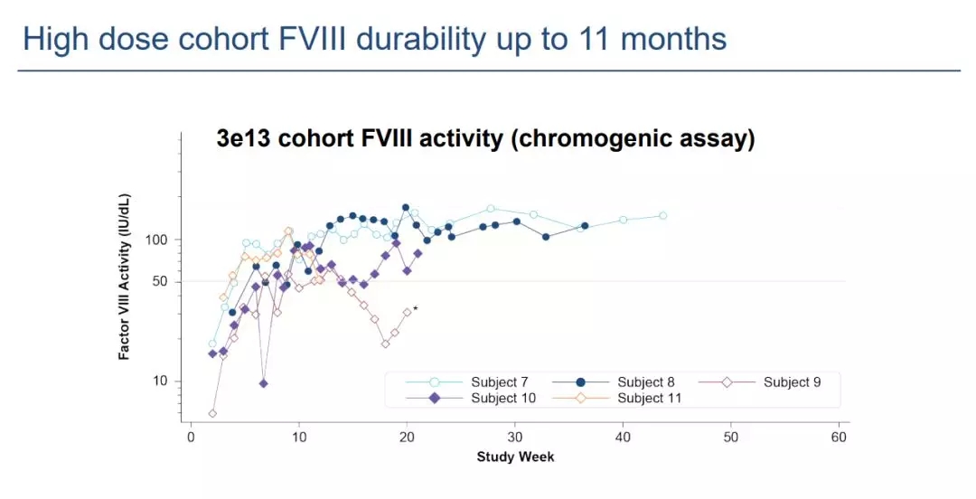 数据显示,使用SB-525时,患者的凝血因子VIII水平呈现剂量依赖性上升;使用凝血因子VIII替代疗法时,患者的凝血因子VIII水平呈现剂量依赖性下降。在1e13vg/kg剂量组中,两位患者的凝血因子VIII活性水平分别在52周和32周内都保持稳定。在3e13vg/kg剂量组中,4位患者分别接受了为期24周、19周、6周和4周的随访。前两位患者(7号患者和8号患者)分别在24周和19周随访中保持了凝血因子VIII正常水平,后两位患者(9号患者和10号患者)分别在6周和4周随访中展现出了与7、8号患者相似的凝血因子VIII活性水平上升模式,即使用SB-525后,患者凝血因子VIII水平可以在较早时间点达到正常水平。