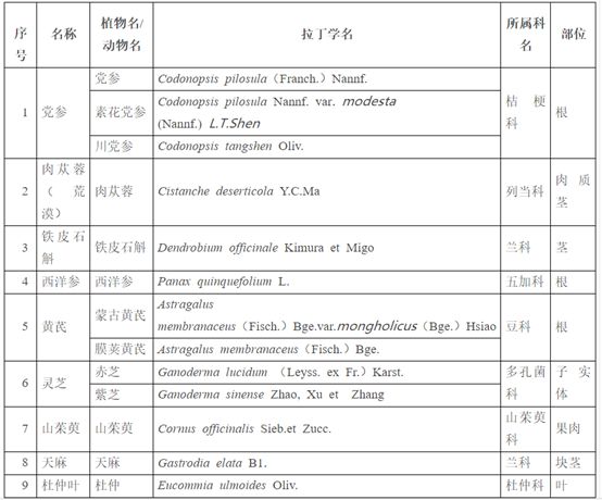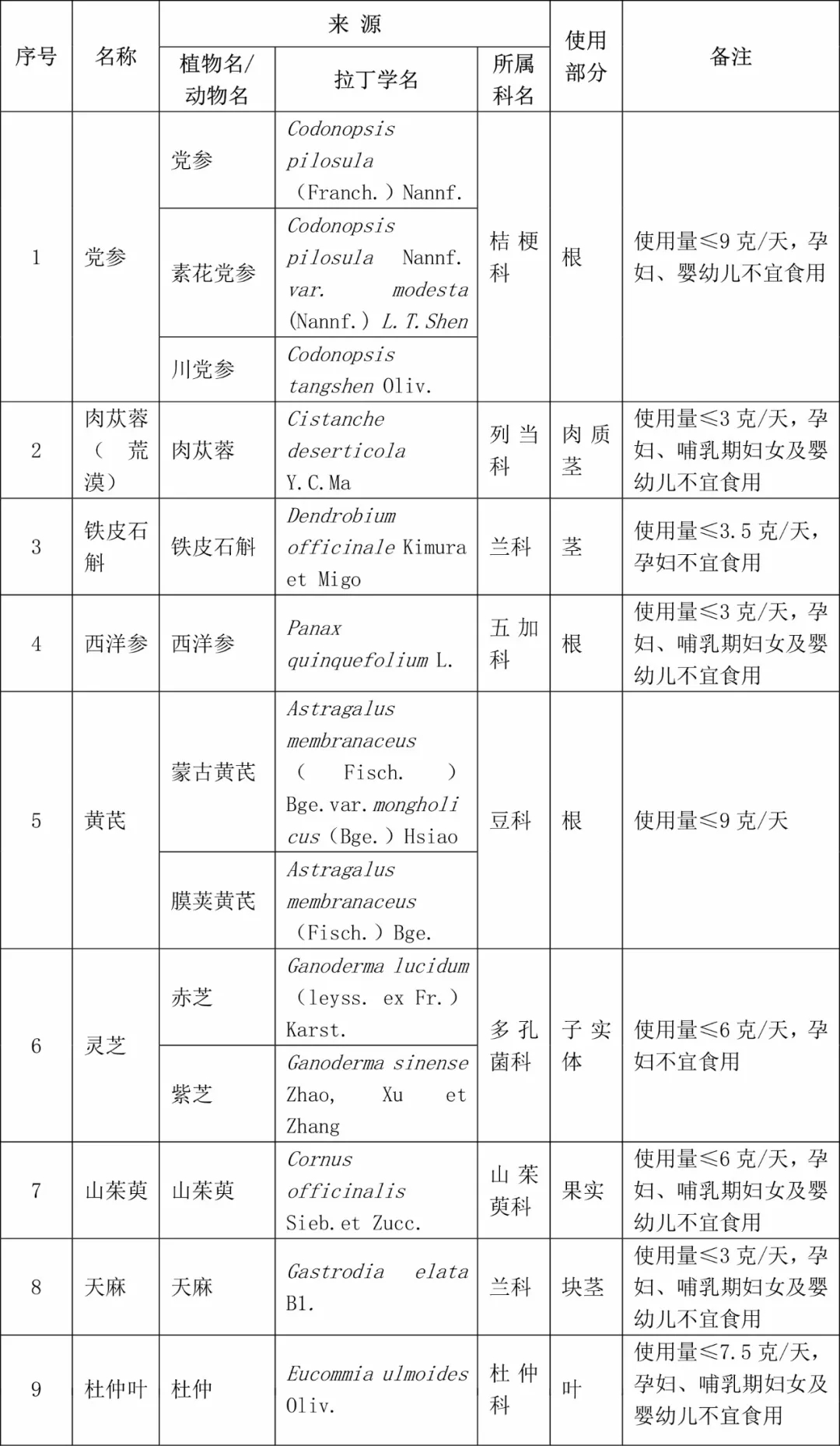 “党参等9种试点按照传统既是食品又是中药材的物质名单”