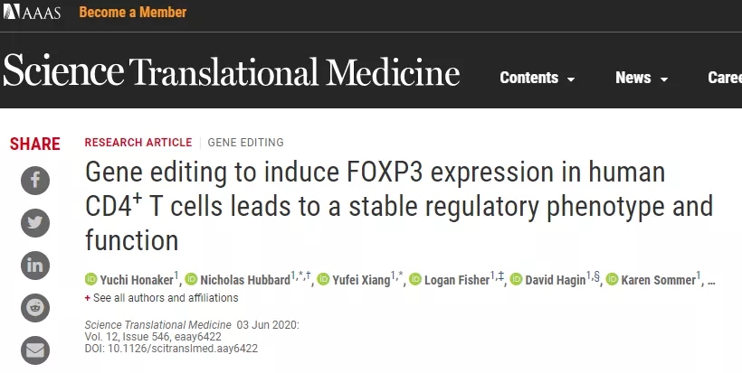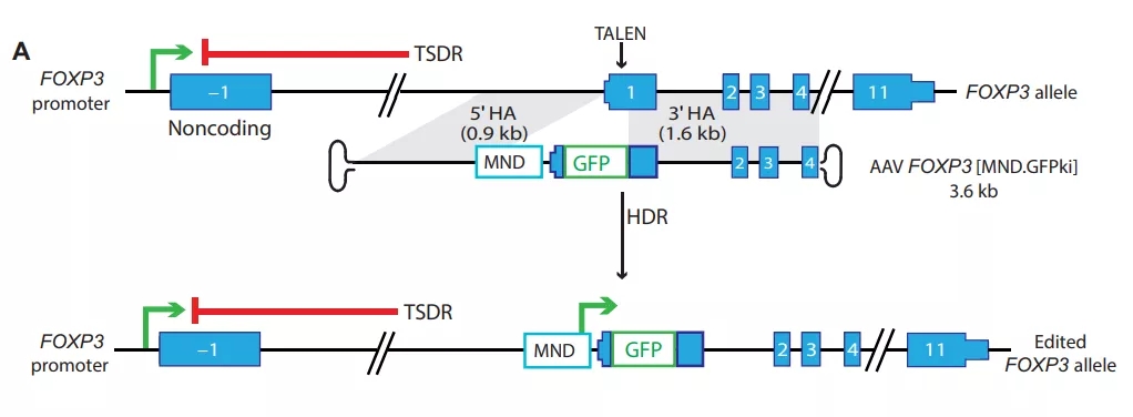 该研究团队从患者的外周血中分离出CD4+ T细胞,并利用同源性定向修复(HDR)介导的基因编辑增强 Foxp3 的表达(Treg的生成由转录因子 Foxp3 调控),以绕过常规CD4+ T细胞中 Foxp3 的正常沉默,从而转化为Treg样细胞。