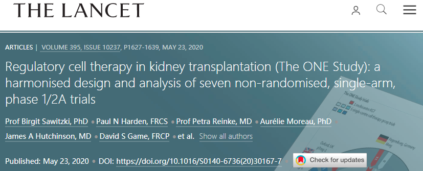 [1] Birgit Sawitzki, et al., (2020). Regulatory cell therapy in kidney transplantation (The ONE Study): a harmonised design and analysis of seven non-randomised, single-arm, phase 1/2A trials. The Lancet, DOI: 10.1016/S0140-6736(20)30167-7
