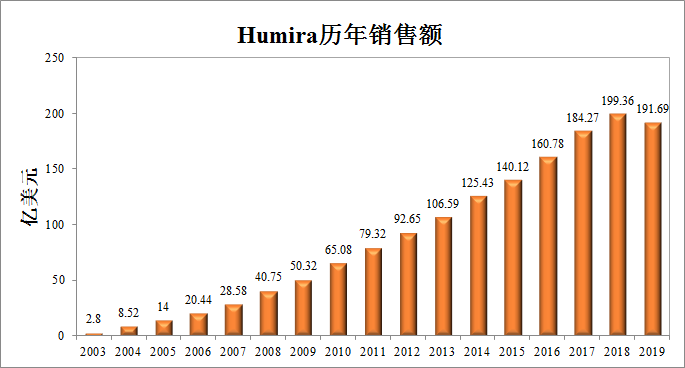 修美乐连续7年蝉联全球“药王”,2018年达到销售额峰值199.36亿美元,受到生物类似药的冲击已经开始缓慢下滑。