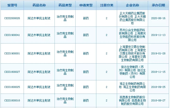 2020年6月16日,正大天晴阿达木单抗注射液的上市申请获得NMPA受理,成为国内第6家申报上市的阿达木单抗生物类似药。此前,百奥泰、海正药业、信达生物、复宏汉霖、君实生物先后递交了阿达木单抗的上市申请。