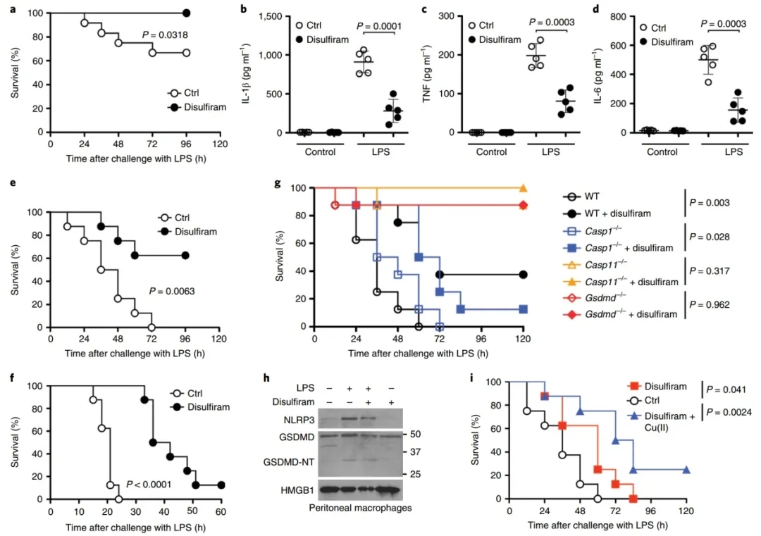 为研究双硫仑在体内的作用,研究人员在C57BL/6J小鼠中检测了脂多糖诱导的脓毒症。最低浓度的LPS (15 mg kg-1)在96小时后杀死8只对照组小鼠中的3只,但所有经双硫仑处理的小鼠均存活(P=0.0318)。所有小鼠均存活12小时后,血清IL-1、TNF和IL-6浓度显著降低。在最高LPS刺激下(50 mg k g-1),虽然所有的对照组小鼠在一天内死亡,但经过双硫仑处理大大延迟了死亡,8只小鼠中有1只存活。在LPS处理后双硫仑治疗可明显延迟死亡。为了确定Cu(II)是否能改善对脓毒症的保护,作者还研究了Cu(II)的补充是否能增强LPS后给予双硫仑的有效性。与模拟处理的对照组小鼠相比,葡萄糖酸铜预处理并在LPS刺激后给予双硫仑提高了存活率。尽管所有的对照组小鼠和仅用双硫仑治疗的小鼠都死亡,但在8只同时使用Cu(II)和双硫仑的小鼠中,有2只存活了下来。