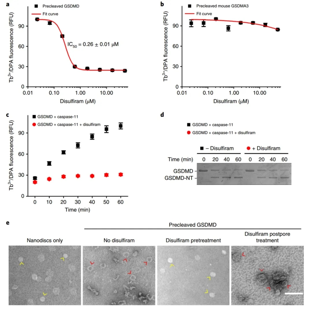 为了分离caspase-11和GSDMD抑制对小孔形成的相对贡献,研究人员首先通过预先裂解的GSDMD检测脂质体渗漏。双硫仑通过预先裂解的GSDMD抑制脂质体渗漏,其IC50为0.26±0.01 uM,这与其抑制全长GSDMD+caspase-11的IC50为0.30±0.01 uM相当。双硫仑不抑制预裂GSDMA3的成孔,说明二双硫仑不抑制整个GSDM家族。然后,在双硫仑(50uM)存在或不存在的情况下,作者进行了脂质体渗漏和caspase-11裂解GSDMD的时间过程。双硫仑对caspase-11处理的GSDMD没有影响,但如果双硫仑存在时,处理后的GSDMD-NT不会引起脂质体渗漏。并发现,双硫仑抑制小孔的形成,但不分解已经形成的小孔。