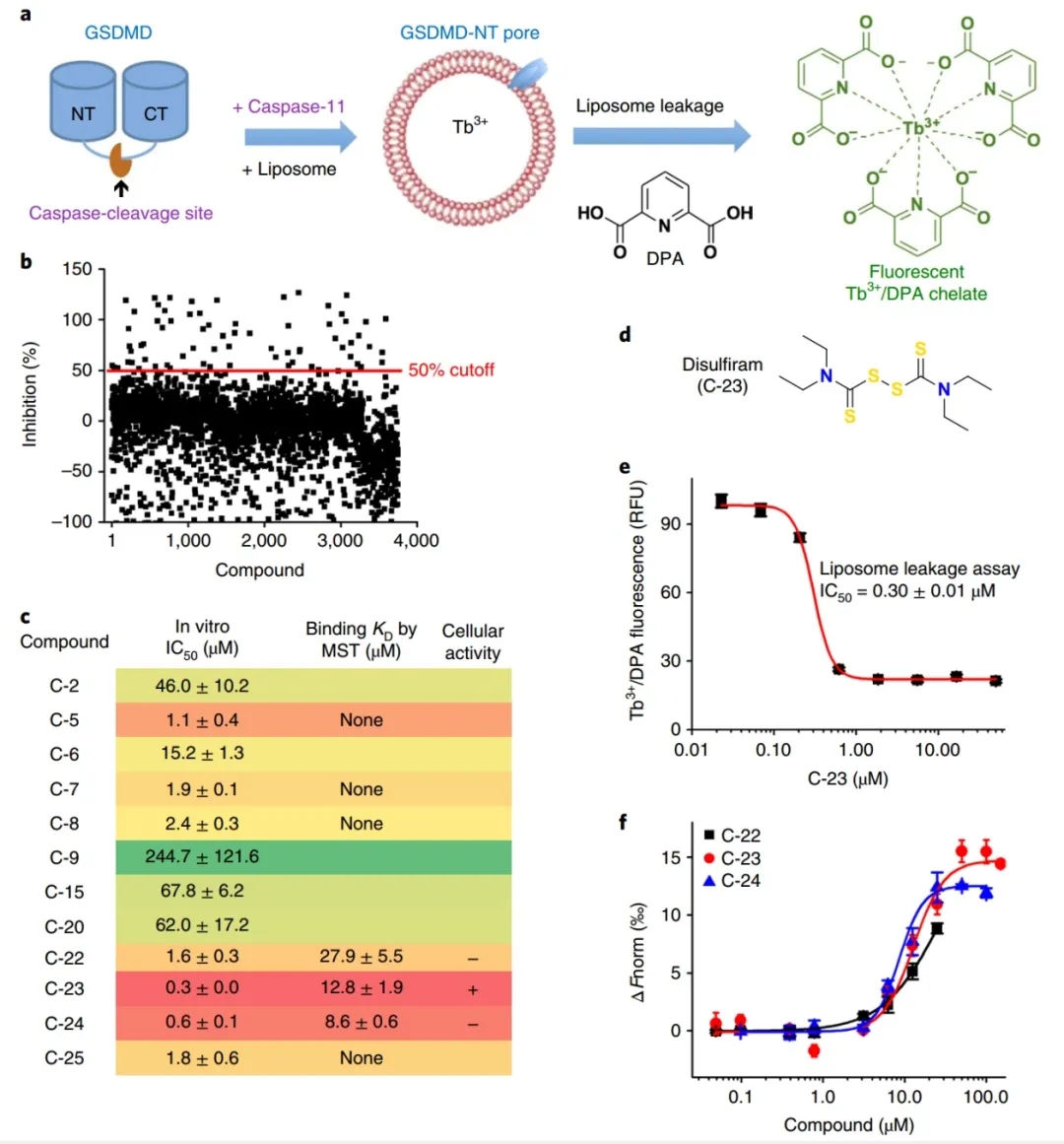 研究人员通过荧光脂质体渗漏试验进行了高通量筛选以发现GSDMD的抑制剂,该试验检测了装载铽(Tb3+)的脂质体与GSDMD和caspase-11孵凝后的泄漏Tb3+。最初从哈佛大学ICCB-Longwood收集的3752个小分子中筛选,寻找能抑制脂质体渗漏的至少50个化合物。在排除了与许多生物靶标和GSDMD无关的荧光猝灭剂发生非特异性反应的泛分析干扰化合物后,作者鉴定出了22种活性化合物(命中率为0.6%),并测量了它们的最大半抑制浓度(IC50)值。最有效的抑制剂是C-23,其IC50为0.30±0.01uM。C-22、-23和-24的IC50值均较低,并通过微尺度热泳(MST)直接与GSDMD结合,一种通过检测样品温度变化时荧光变化来定量结合的技术。