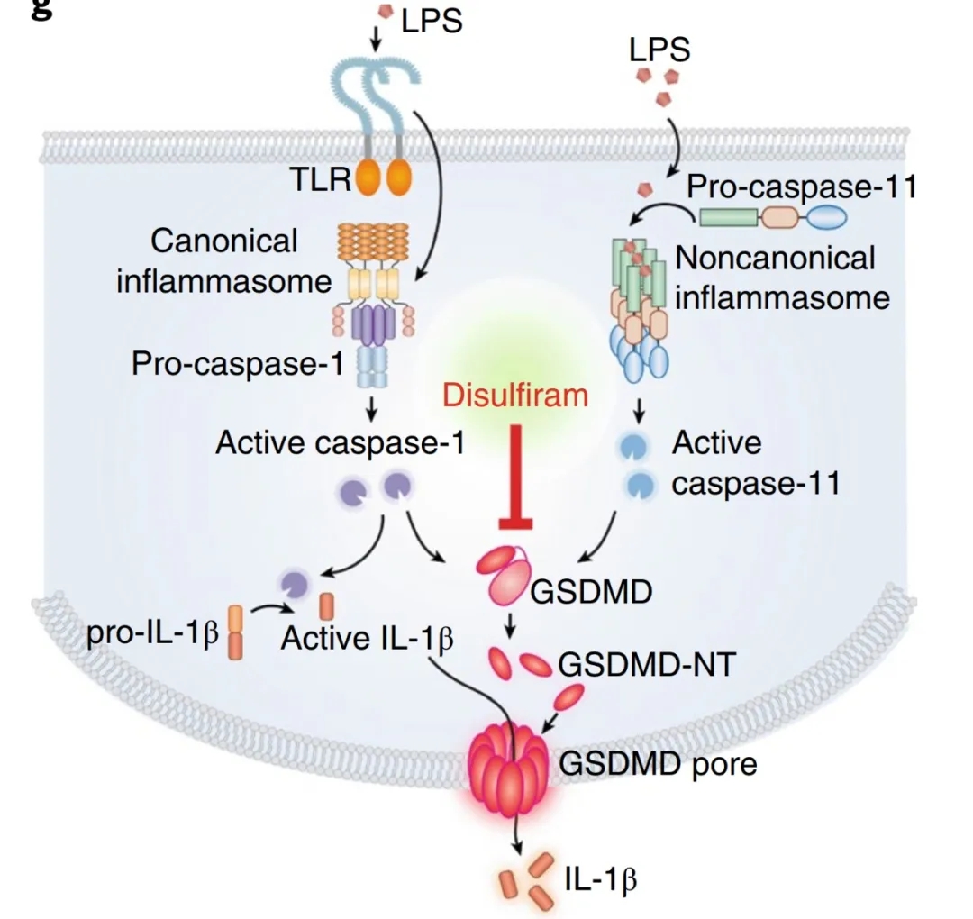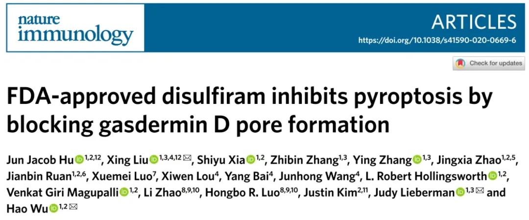 2020年1月30日,来自美国波士顿儿童医院的Program in Cellular and Molecular Medicine的Xing Liu、Judy Lieberman 和Hao Wu教授课题组在Nature Immunology(IF: 23.53)杂志上发表题为“”的文章[1]。该研究表明双硫仑可阻断细胞的焦亡和细胞因子的释放,并可阻断脂多糖诱导的小鼠的败血性死亡。双硫仑抑制GSDMD的作用为该药物安全用于对抗炎症提供了新的治疗指征。