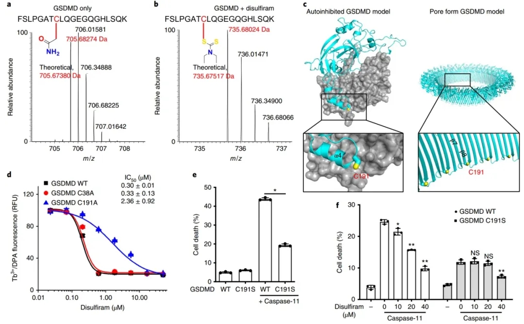 为了探讨双硫仑抑制GSDMD的机制,研究人员采用纳米液相色谱串联质谱(nano-LC-MS/MS)分析了双硫仑对人GSDMD的抑制作用。胰蛋白酶片段显示Cys191的二硫代二乙基氨基甲酰加合物,其中一半对称的二硫脲分子附着在硫醇上。事实上,Cys191对于细胞中GSDMD孔的形成是重要的,因为小鼠GSDMD中相应的Cys192的Ala突变抑制了寡聚化。该Cys残基在GSDMD中保守,但在其他GSDM家族成员中不保守,在全长自抑制结构和基于小鼠GSDMA3结构生成的N端孔形态模型中均可获得。为了证实双硫仑作用于Cys191,作者首先比较了野生型、C38A对照或C191A人GSDMD + caspase-11处理脂质体的成孔情况。双硫仑作用于C191A GSDMD的IC 50大约是野生型GSDMD的8倍,而C38A的活性与野生型GSDMD相似,这证实了Cys191对双硫仑活性的重要性。虽然单独野生型和C191S突变GSDMD并不影响细胞的存活,但野生型GSDMD和caspase-11共同作用导致大量细胞死亡,而C191S突变GSDMD和caspase-11的细胞死亡降低。