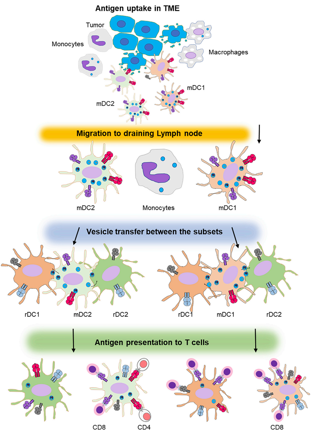 具体来说,肿瘤微环境中的迁移型树突状细胞(mDCs),会用囊泡把抗原带出来,交给淋巴结中的组织驻留型同伴(rDCs),由它们激活CD8+/CD4+T细胞。如果不能形成囊泡,T细胞就无法被激活[1]。