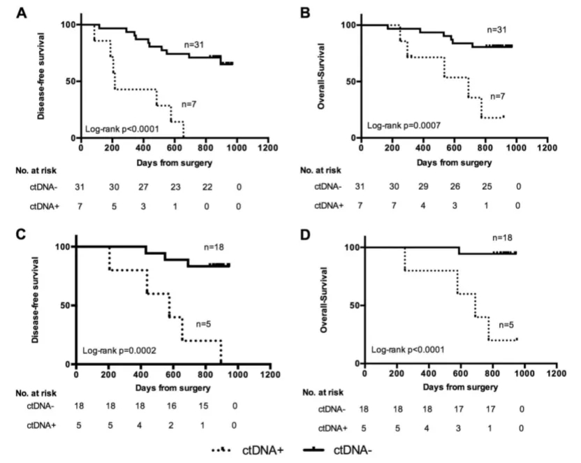 研究在术后9~48天,辅助化疗开始前,采集了38例患者的血液样本进行ctDNA检测,7例(18%)患者ctDNA阳性。不出所料,ctDNA 阳性患者100%出现复发,患者的DFS与OS普遍较差。在辅助化疗完成后,23例患者继续接受ctDNA检测,5例ctDNA阳性患者均出现复发,患者的DFS与OS同样较差。这充分表明ctDNA可反映患者体内微小病灶残留问题。