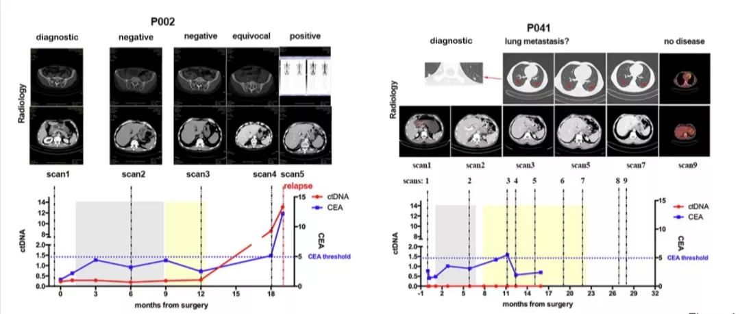 因手术或者治疗等原因带来的组织变化,或者疾病变化早期,肿瘤细胞极微量,导致常规影像学监测病情存在一定的局限性,ctDNA检测可以做为很好的补充手段。例如,本研究中患者P041,辅助治疗过程肺部出现阴影,怀疑转移,然而ctDNA检测持续阴性,而后PET-CT检测也排除了疾病进展,证实ctDNA检测可靠性。相反的,在患者P002中,影像学和CEA都无迹象时,ctDNA就出现在血液中,并且表现出上升,患者也确实在随后出现了疾病进展。