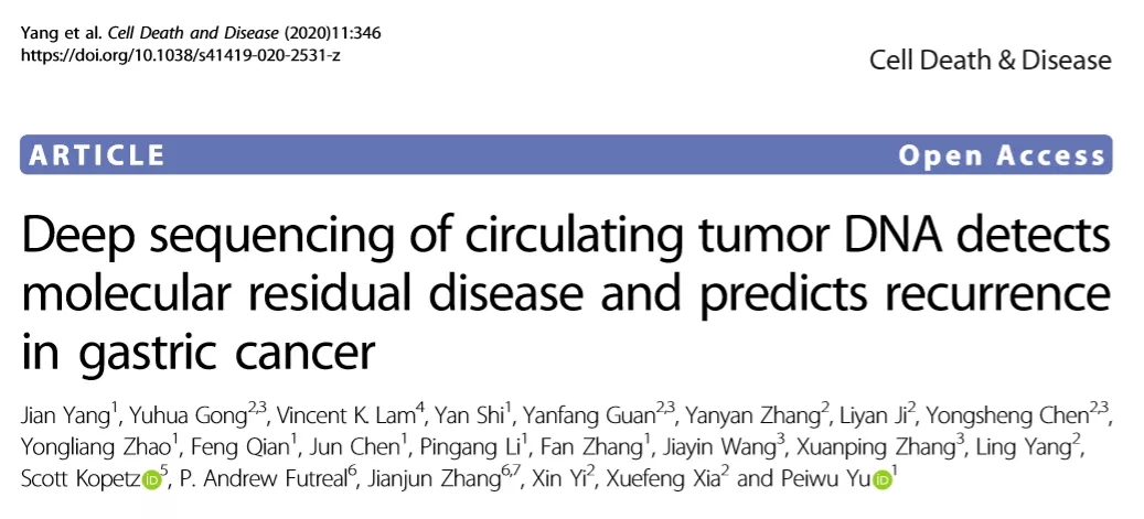 近日,陆军军医大学第一附属医院(西南医院)余佩武教授团队与吉因加合作,首次探索了ctDNA在胃癌复发风险分层中的应用,系统分析了不同时间节点ctDNA检测对于胃癌复发风险的预测能力,文章已在线发表于Cell Death and Disease(IF=5.959)。