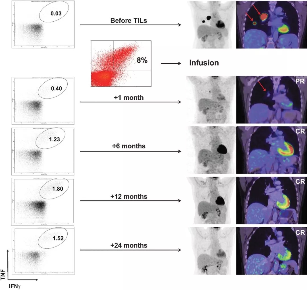 一位晚期黑色素瘤患者肿瘤在治疗前出现广泛转移,在接受TILs疗法后一个月病灶明显缩小,治疗6个月达到完全缓解,治疗两年后仍然处于完全缓解状态,并且体内持续存在肿瘤反应性CD8 + T细胞。
