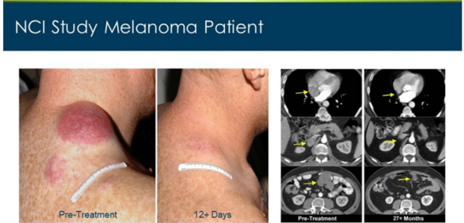 2009年Rosenberg教授发表的针对黑色素瘤的三项连续的临床试验中,接受TILs治疗的客观缓解率在49%至72%之间。其中25名接受TILs疗法的试验中,有7名(28%)达到了完全缓解!值得一提的是,完全患者的患者大部分可达到临床治愈!其中一位患者在接受治疗的12天肿瘤就出现了迅速的缩小。