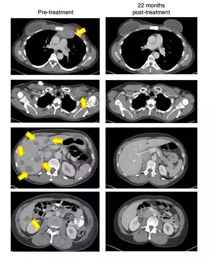 22个月后,我的影像检查显示(黄色箭头)肿瘤消失得无影无踪(图片来源:《Nature Medicine》)