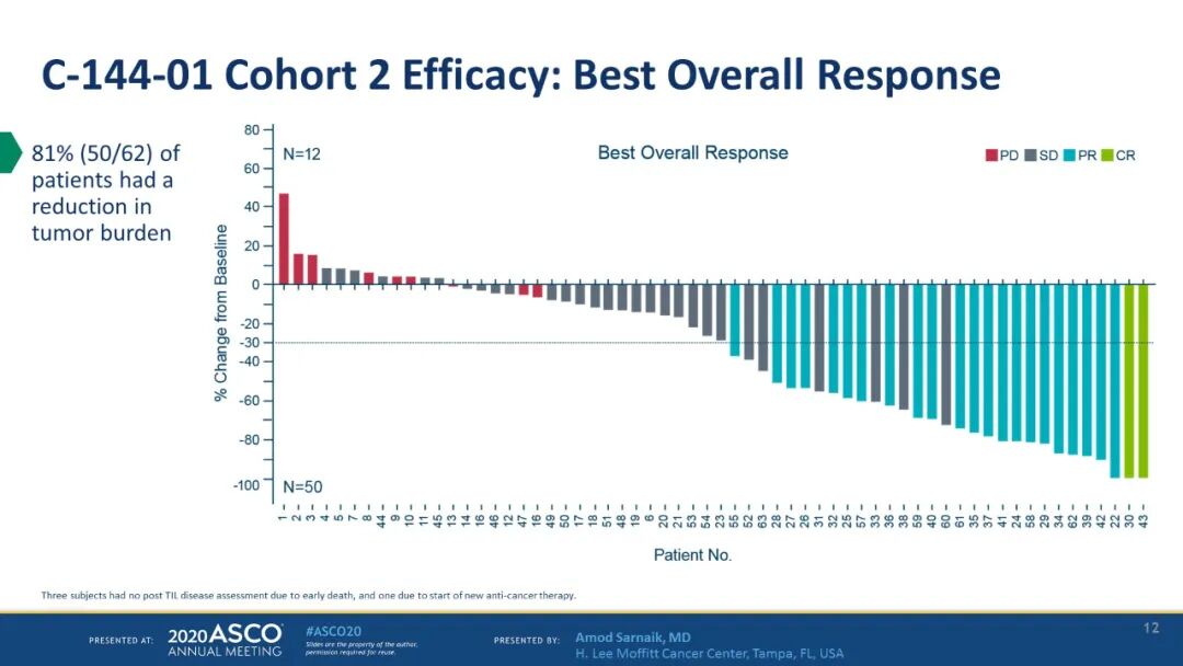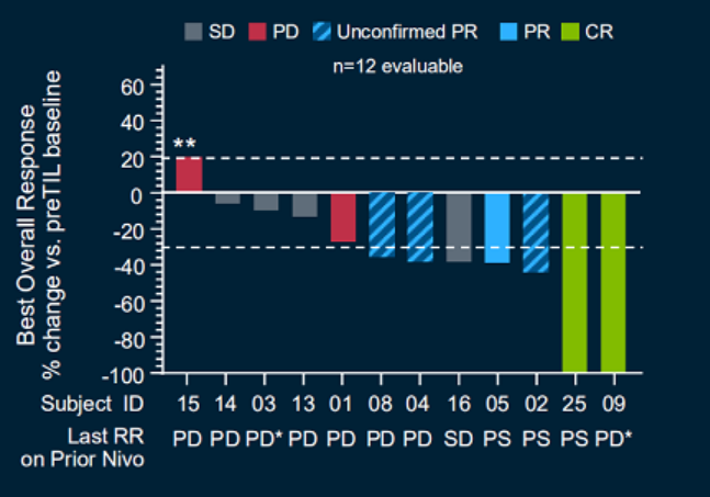 这项试验共有32名患者参加,最终有16名患者接受TILS治疗,其中12名患者可以评估。在平均随访1.4年时,3名患者病情缓解,其中两名完全患者,并且已超过一年。另一名患者的缓解即将得到确认。