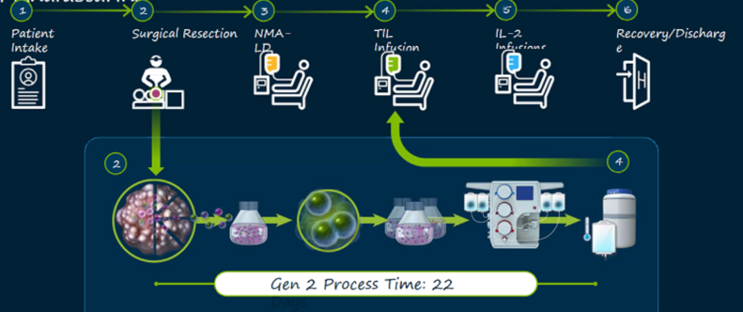 第六步,患者开始一周的预处理治疗(清髓)以准备接受TIL.TIL产品作为一次性疗法施用,在TIL输注后立即接受多达6剂白细胞介素2(IL-2),来支持患者体内TIL的生长和激活。