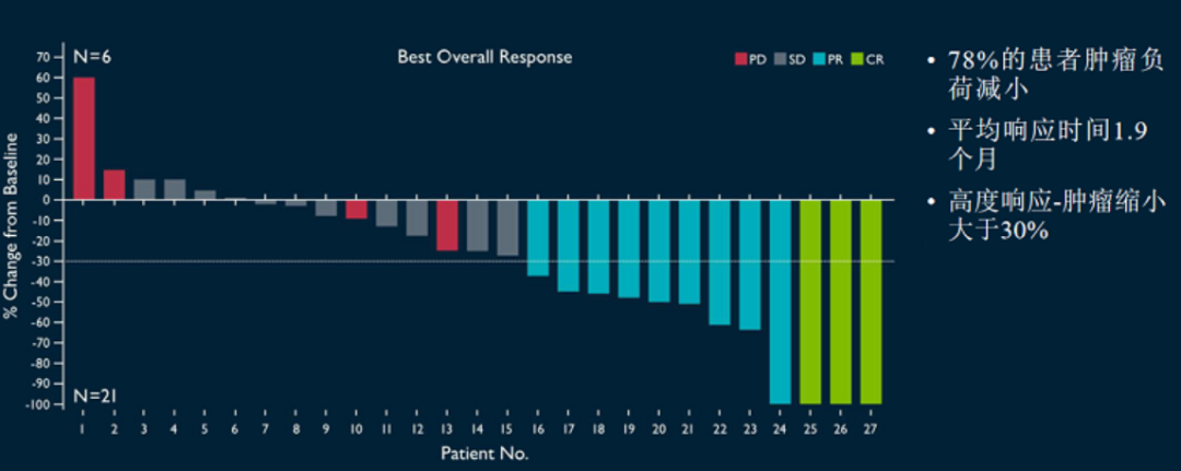客观缓解率(ORR)44%,完全缓解率(CR)11%,疾病控制率(DCR)高达85%。即12名的患者有效果,包括1名完全应答,9名部分应答和2个未确认的部分应答;