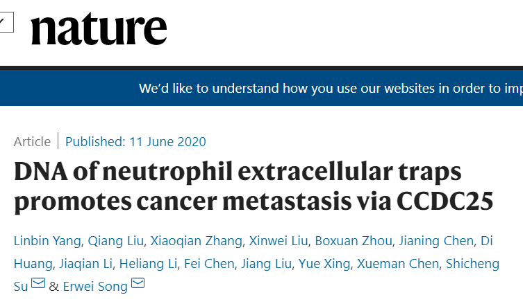 [1] Linbin Yang et al. DNA of neutrophil extracellular traps promotes cancer metastasis via CCDC25. Nature(2020).