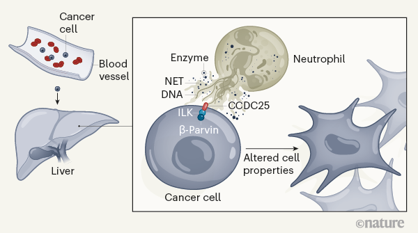 研究报告称,在小鼠模型中,在转移性细胞可被在肝脏中检测到之前,NET就已经在那里“出现”了。研究发现,癌细胞转移到肝脏中的能力依赖于NET,因为在当移除NET后(通过DNA降解酶DNase I,或小鼠被基因改造使缺乏NET形成所需要的一种酶),转移大大受损。