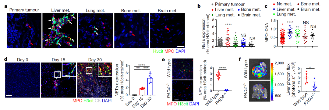 为了调查NET和癌细胞的关系,研究者们将人源或鼠源的乳腺癌细胞移植到小鼠体内,并分析转移性肿瘤细胞。结果显示,NET在两种小鼠模型的肝脏中都有积累。这一发现与来自患者的分析结果一致。