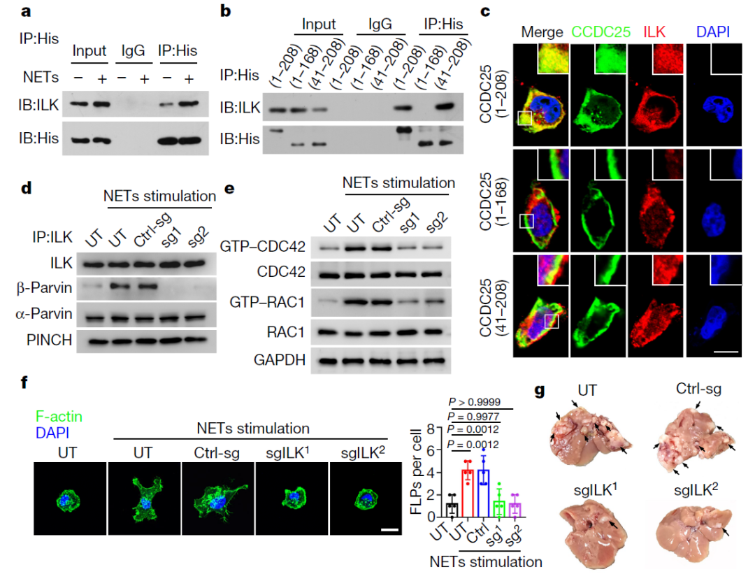 最后,科学家们揭示了肿瘤细胞是如何从NET与CCDC25的互相作用中获益的。他们找到了癌细胞中与CCDC25相互作用的蛋白质——整合素连接激酶(integrin-linked kinase, ILK),一种调节细胞迁移和增殖等过程的酶。当ILK或其下游信号伙伴被移除,蛋白质β-parvin会失去功能,癌细胞在体内的生长和运动会严重受损,在小鼠中,肝转移会减少。这些结果表明,NET DNA与CCDC25的结合通过激活一个ILK介导的信号级联增强了癌细胞的侵袭性行为。