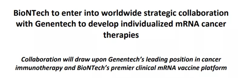2016年9月,罗氏旗下的基因泰克(Genentech)与BioNTech达成全球战略合作,开发、制造和商业化基于mRNA的个性化癌症疫苗。这项合作将基因泰克领先的癌症免疫疗法产品和研究计划与BioNTech专有的mRNA癌症疫苗技术平台以及个性化医学专业知识相结合。而RO7198457就是由这一合作孕育出的在研疫苗。