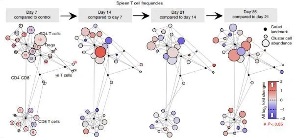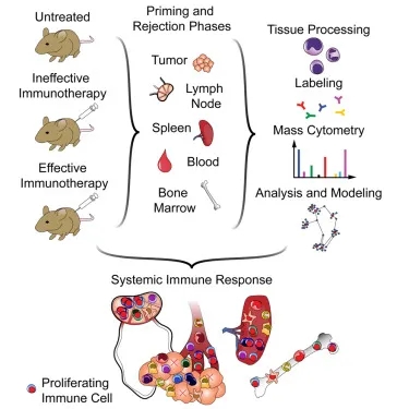Spitzer的实验室团队,包括该研究的主要作者Breanna Allen和Kamir Hiam确定了来自患不同肿瘤(脑癌、结直肠癌、胰腺癌、皮肤癌和乳腺癌)的小鼠的血液、骨髓、脾脏以及靠近未治疗肿瘤的淋巴结的外周免疫细胞的封堵和活性。他们使用了质谱流式技术,这是一种最近改进的技术,依靠独特的金属分子标记和质谱来快速量化和识别处于不同激活状态的数十种细胞类型。