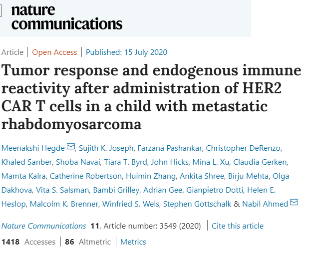 1.Tumor response and endogenous immune reactivity after administration of HER2 CAR T cells in a child with metastatic rhabdomyosarcoma