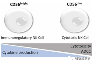 NK细胞主要来源于骨髓CD34+淋巴细胞,约占外周血淋巴细胞总数的10%~20%,NK细胞不表达特异性抗原识别受体,是不同于T细胞、B细胞的第三类淋巴细胞。目前NK细胞的定义为TCR-、mIg-、CD56+、CD16+的淋巴细胞,根据CD56表达水平的高低可将NK细胞分为2个细胞亚群:CD56dim和CD56bright,其功能有所不同: