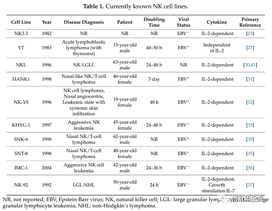 NK细胞有许多成熟的细胞系,包括NK-92、NKG、YT、NK-YS、HANK-1、YTS和NKL等,NK细胞系体外扩增得到的细胞群体一致性更好,且NK细胞系并不涉及分选纯化步骤。目前已有的NK细胞系列表如下: