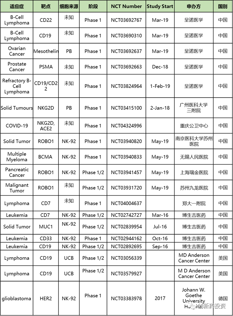 目前尚未有上市的CAR-NK细胞产品,与CAR-T相比,CAR-NK细胞的研发管线数目较少。在clinicaltrials.gov以“CAR NK”为关键字进行检索可发现,目前共有19项CAR-NK相关的临床试验正在进行,其中中国进行的临床实验共19项,如下表所示。中国共有2家公司举办CAR-NK细胞疗法临床试验,分别是北京呈诺医学科技有限公司与博生吉医药科技(苏州)有限公司;美国只有MD Anderson Cancer Center的2项临床试验,德国有一家医院上榜。瘤种的选择上,仍以非实体瘤为主,但在多种实体瘤中已有尝试。细胞来源方面NK-92细胞系占了大头: