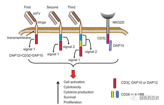 CAR-NK细胞的CAR结构通常也由三部分组成,即胞外抗原结合区(一般为scFv)、跨膜结构域以及胞内激活结构域,这与CAR-T细胞疗法中使用的CAR结构十分类似甚至雷同(事实上,目前的很多研究直接是把CAR-T中成熟的CAR结构在NK细胞系中表达来制备CAR-NK)。根据胞内区域的不同,CAR结构已经发展到第三代: