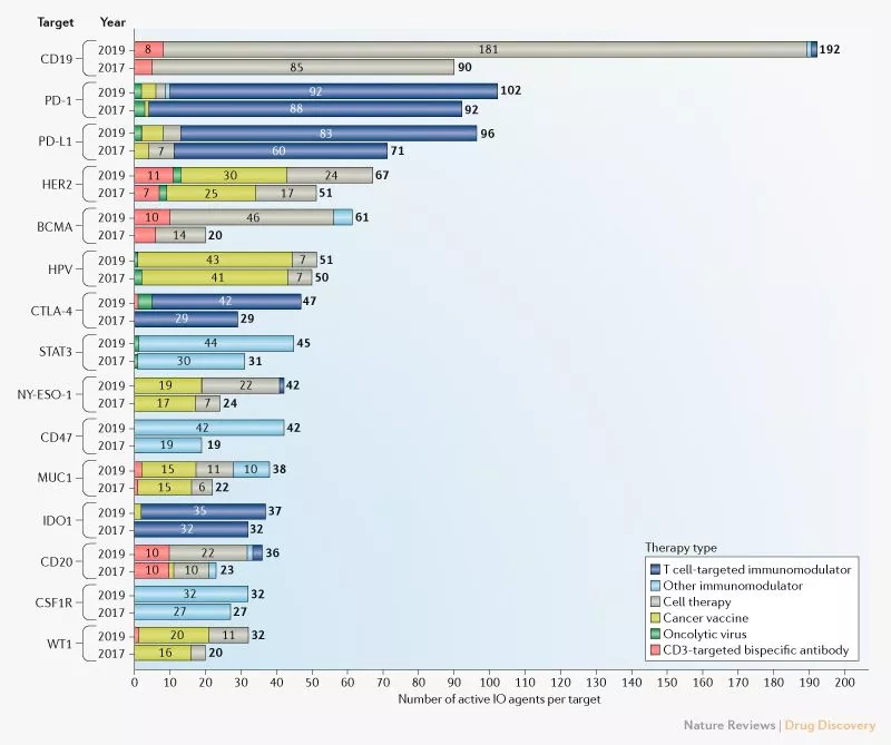 去年9月,美国癌症研究所(CRI)在Nature Reviews Drug Discovery上发表的一篇名为Immuno-oncology drug development goes global的研究论文,对肿瘤免疫治疗领域药物研发的全球概况进行了表述,在近两年时间内,CD19已超越PD-1和PD-L1,成为最热门的免疫肿瘤学靶点,随着CD19靶点的持续火热,靶向CD19产品的多样性也得到丰富,CAR-T、双抗、单抗、ADC等疗法都得到相应的开发。