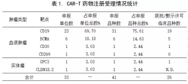 自南京传奇于2018年3月13日拿到国内首份CAR-T药物临床试验批件以来,CAR-T药物研发项目出现井喷式增长。截止2020年5月31日,共有41个该类药物的IND申报获得CDE受理,适应症和靶点的申报情况见下表1。