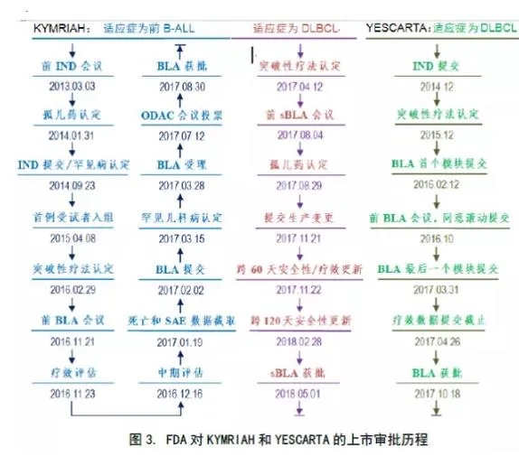 或许,我们稍稍考察一下已获批上市的CAR-T类药品——诺华的KYMRIAH和凯特(现为吉利德)的YESCARTA,他们的上市之路,可能会得到一些启发(见下图3)。