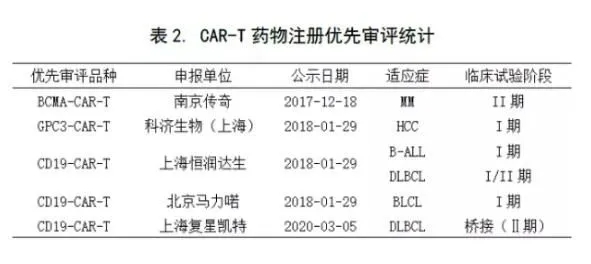 值得注意的是,少数企业着手布局其他CAR-T品种,赢得先机。如南京传奇申报了BCMA-CAR-T(全球首创针对多发性骨髓瘤的新靶点),科济生物申报了GPC3-CAR-T(全球首创针对实体瘤的新靶点)(见下表2)。