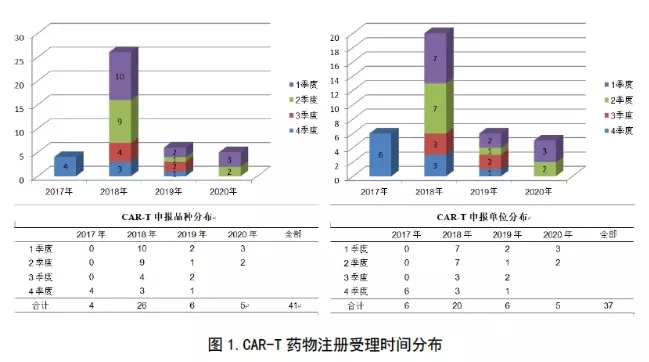从图1中可见,无论从申报品种数,还是从申报单位数上说,2018年堪称CAR-T注册申报最“拥挤”的一年。尤其是前两季,申报品种19个,申报单位累计达14家,差不多占到迄今申报总数的一半。现在注册数量年均在10个(家)以下,季均在1-2个(家)左右。