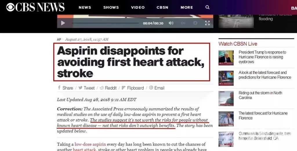 另一项哈佛大学主持的实验覆盖了 12546 名志愿者,在长达12年的随访中,相比服用安慰剂的对照组,服用阿司匹林只让心肌梗死、中风、心血管原因死亡等严重不良事件的发生几率下降了 4%,这是一个很难看的数字。该研究结果发表在医学杂志《柳叶刀》上。