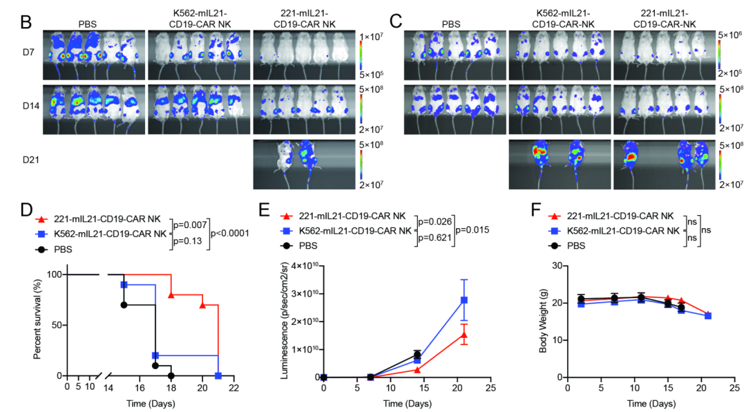 在CAR-NK细胞中,221-mIL21饲养细胞同样展示出良好的CAR-NK细胞增殖。随后,研究人员进一步测试了CAR-NK细胞的抗肿瘤活性,将两种扩增途径的CD19 CAR-NK细胞输注到淋巴瘤细胞异种移植NSG小鼠体内,结果显示:与K562-mIL21饲养细胞扩增的CD19 CAR-NK细胞相比,使用221-mIL21扩增的CD19 CAR-NK细胞具有更好的抗肿瘤活性。