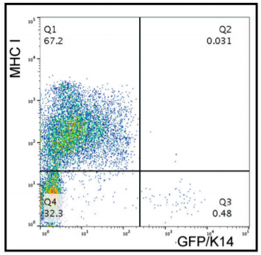 首先,他们从转基因小鼠中分离出K14+乳腺癌细胞和K14-乳腺癌细胞。在分离的过程中,他们发现癌细胞的K14+表达量和MHC I表达量呈现反相关关系,这意味着K14+细胞对NK细胞介导的细胞毒作用是易感的。