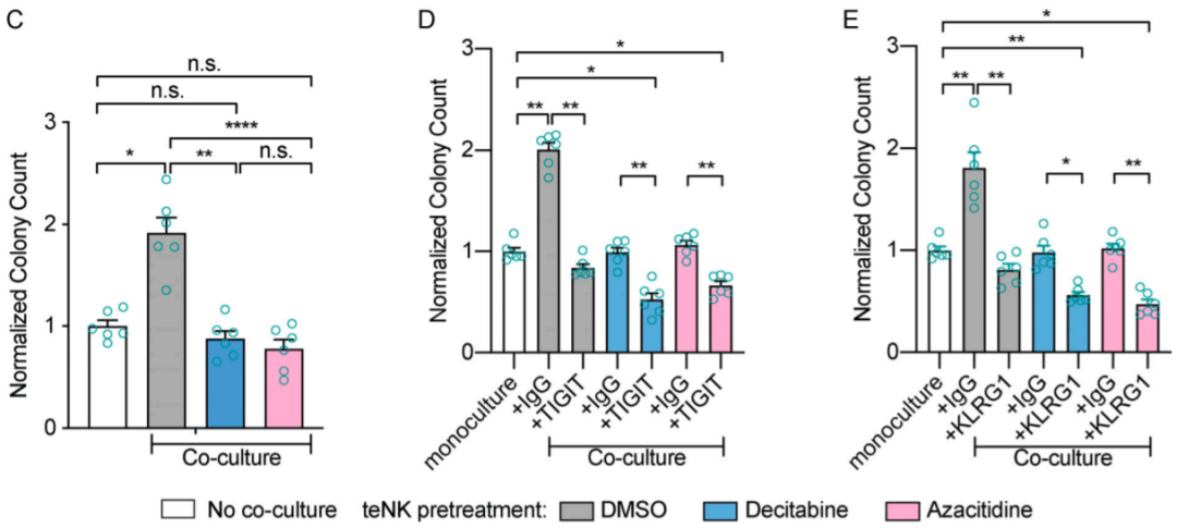 而为了能对药物开发和临床治疗有所启发,研究人员们必须尝试逆转癌细胞对NK细胞的改造现象。基于NK细胞和teNK细胞的RNA-seq数据,他们通过分析和推理,锁定了包括TIGIT和KLRG1在内的几个靶点。实验证明,anti-TIGIT或anti-KLRG1的单克隆抗体能够抑制teNK诱导的癌细胞克隆形成,而anti-PD-1的抗体则没有明显的效果。