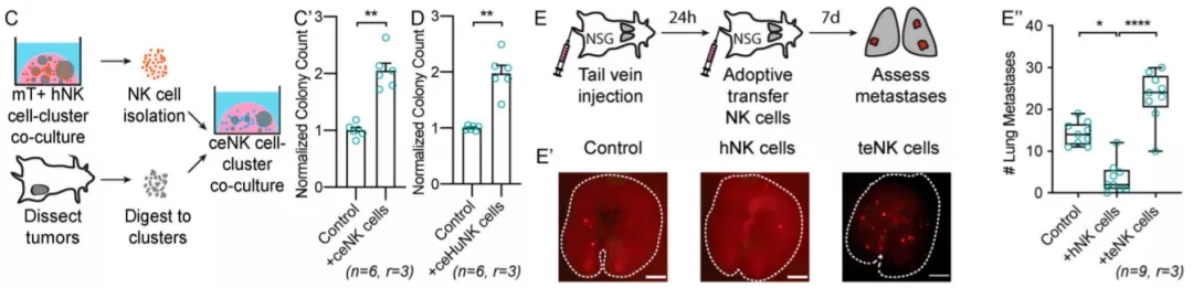 随后,他们从荷瘤小鼠中分离肿瘤浸润性NK细胞(“Tumor-infiltrating NK”,简称“tiNK”),与癌细胞共培养,得到了类似的结果。另外,他们将经过共培养的teNK分离出来,与癌细胞进行新的共培养实验,发现这些teNK细胞对癌细胞克隆形成的促进作用比NK细胞更为明显。体内实验也得到了相同的结果。这些实验充分证明了癌细胞对NK细胞的“education”。