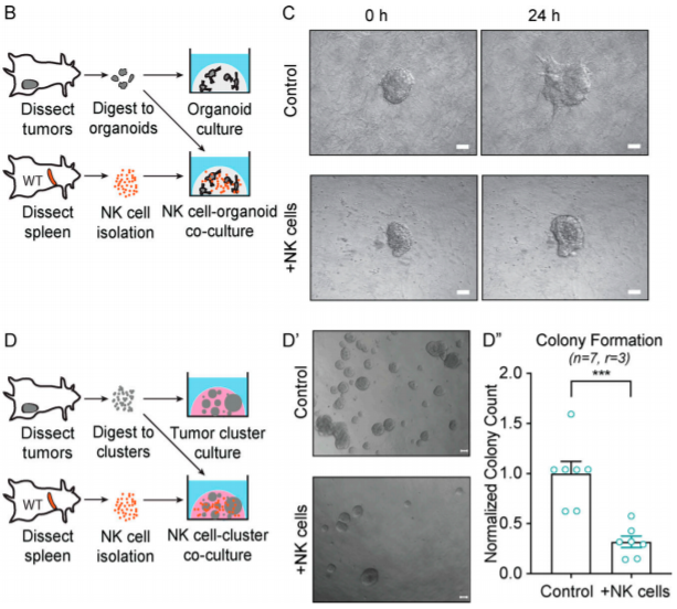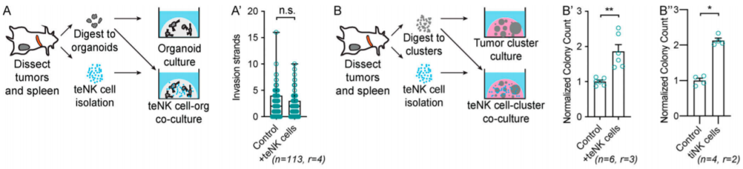 为了验证这个假设,他们从荷瘤小鼠体内分离NK细胞(称为“Tumor-exposed NK”,简称“teNK”),与癌细胞共培养。结果显示,这些teNK细胞不仅不能抑制肿瘤organoid的侵袭,甚至会促进癌细胞的克隆形成。