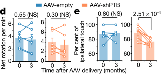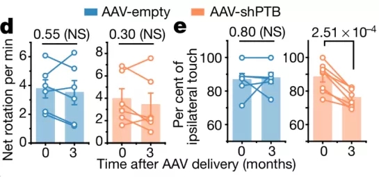 此外,他还向帕金森模型小鼠的中脑区域注射 AAV 病毒敲低 PTB,小鼠运动能力显著恢复,提示新转化出的神经元具有参与运动控制的功能。