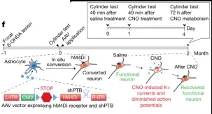 于是,他们根据此前的实验条件诱导星形细胞转化为神经细胞,并使得这些转分化的神经细胞表达化学遗传学受体。他们首先观察到帕金森模型小鼠的异常行为因为这些转分化神经元的作用而得到恢复;随后再用配体药物 CNO 激活这些受体,转分化的神经元的功能被抑制,而异常行为则再次出现;最后随着配体逐渐被代谢,转分化神经元的功能又得到恢复,而异常行为也同步改善。由于这些化学遗传学受体只表达在转分化神经元上,而与其他细胞无关,所以该实验能有力证明动物行为改善是直接来自于新生的神经元。