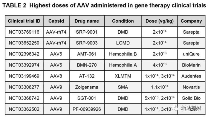 死亡的2名男孩都是ASPIRO试验的大剂量组。通过静脉内给药,他们每千克体重接收3×1014vg/kg个载体基因组(vg/kg)。这是有史以来对成人或儿童施用的最高AAV剂量之一(见表2)。根据试验申办者的声明,两名男孩均处于年龄的上限(小于5岁)。