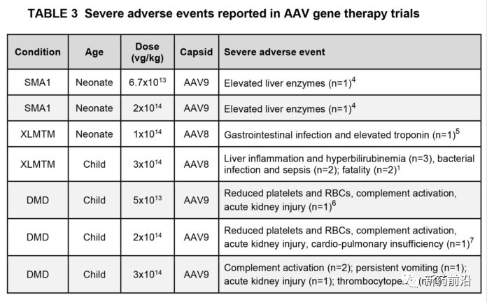 相关地,接受高剂量全身AAV的患者中还发生了其他几种严重不良事件(严重程度不同)(表3)。这些在很大程度上是由于先天免疫反应(例如炎症和补体激活)和静脉内给药后几天至几周对载体的细胞免疫反应引起的。