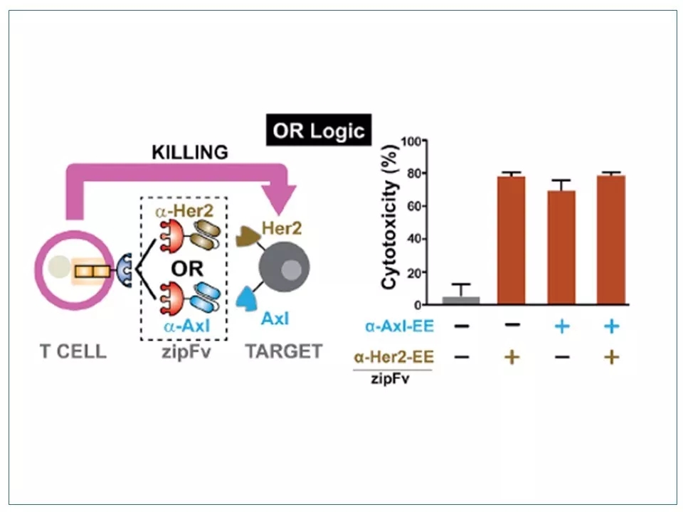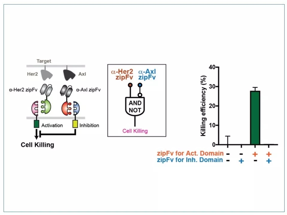 25 SUPRA CAR系统实现的“A AND NOT B”逻辑门展示。一种免疫细胞转基因后,其表面会表达两种zipCAR,其中一种的膜内域被激活后会抑制另一种的信号通路。在这个例子中,a-Her2 zipFv通路激活了免疫细胞,但加入a-Axl zipFv会抑制免疫细胞的激活,从而减弱了对肿瘤细胞的杀伤作用。