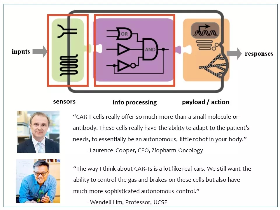 12 CAR-T不同于小分子药或蛋白药。它是“活”的药,而且可以添加很多功能。改进CAR-T的一个方向是借鉴系统生物学/合成生物学的理论,引入传感器、逻辑门、逻辑电路等概念,把它打造成一个机器人或智能系统。CAR-T is an engineered cell. Then why don’t we engineer the heck out of it?