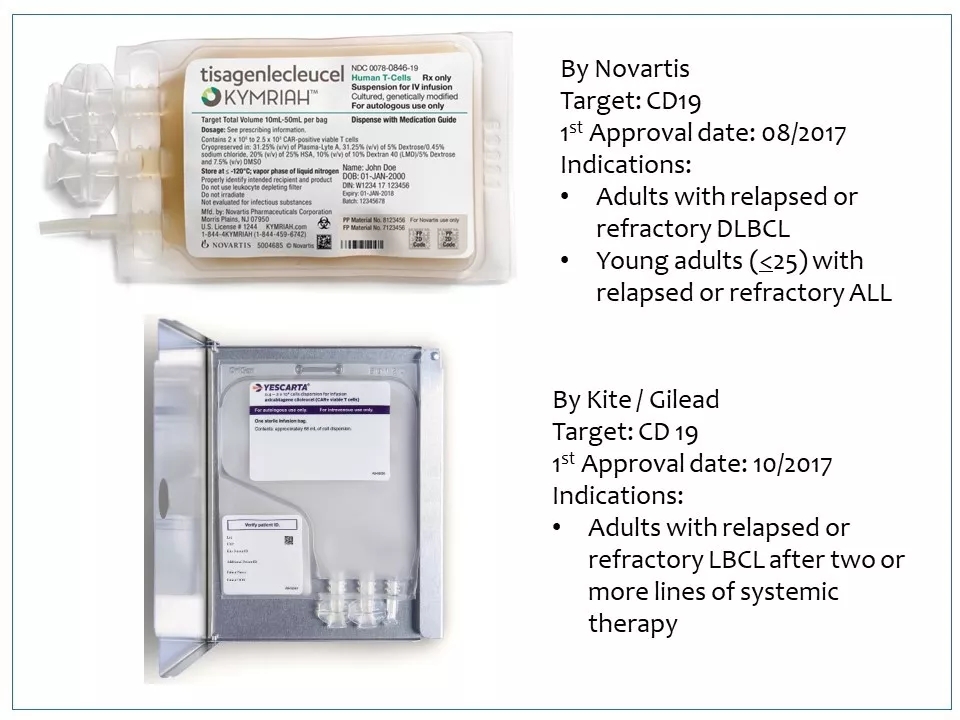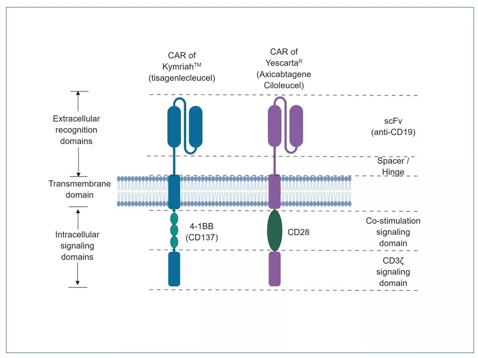 6 迄今为止,已有两个CAR-T产品进入市场: KymriahTM和Yescarta®。二者都是第二代CAR-T,一个重要的区别是它们的CAR蛋白的共刺激域不同。两个产品在临床上的不同表现也许是源于这一差异:Yescarta®在病人体内增殖快,但持久性差,有可能引起早期细胞因子风暴(CRS);而KymriahTM在病人体内增殖慢,但持久性好,有可能引起延迟的CRS。